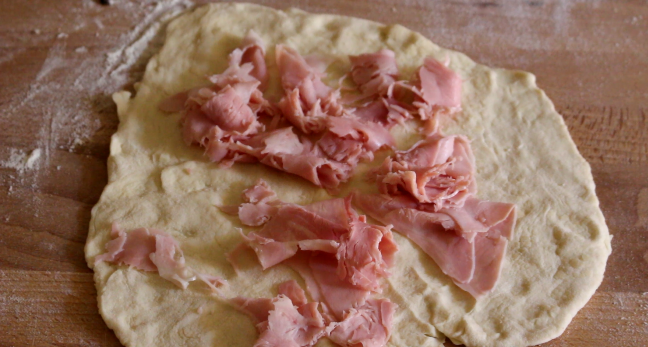 Dividiamo il panetto in più parti, stendiamo con un mattarello e distribuiamo sulla superficie lo stracchino e il prosciutto.