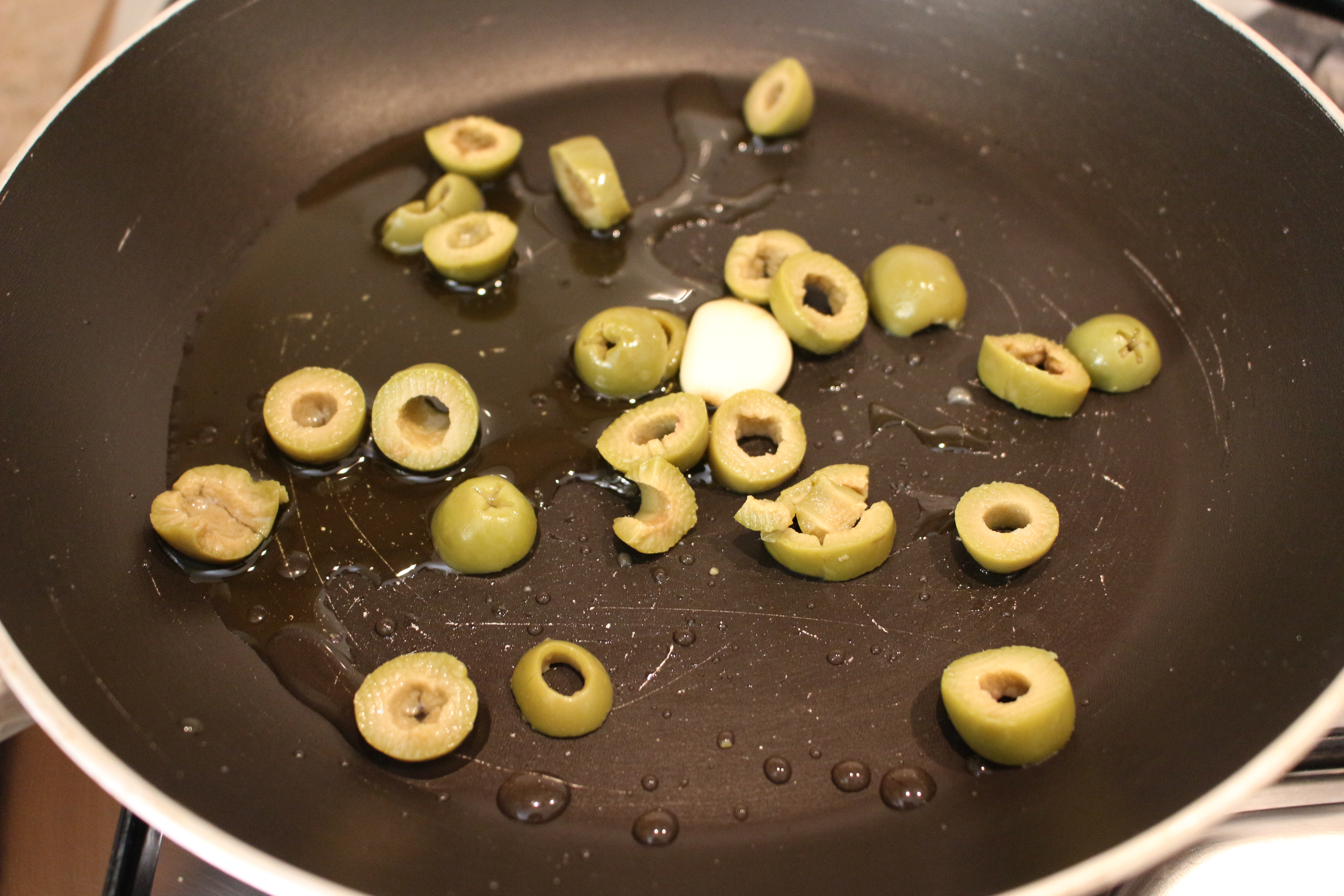 Laviamo, puliamo e lessiamo i fagiolini. In una padella facciamo rosolare l’aglio con l’olio, non occorre troppo olio altrimenti la ricetta risulterà pesante. Poi aggiungiamo il tonno sgocciolato, le olive verdi denocciolate tagliate a fettine e infine i fagiolini. Saliamo a piacere, senza esagerare perché già le olive e il tonno sono salati.