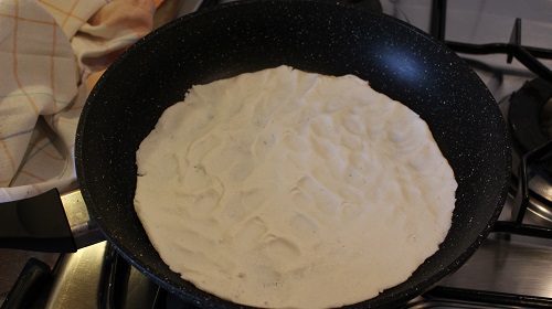 Dividiamo il panetto in 2 parti, stendiamo la prima con le mani direttamente in una padella con il fondo spesso. L’impasto tenderà a rompersi, è normale, procedete “rattoppando” con dell’altro impasto. A questo punto farciamo a piacere e chiudiamo con l’altra metà di impasto. (Per richiudere potete procedere aggiungendo un pezzetto alla volta, oppure mettendo l’impasto tra due fogli di carta da forno, stendendolo con l’aiuto di un mattarello e riponendolo sulla parte già stesa, rimuovendo la carta da forno.)
